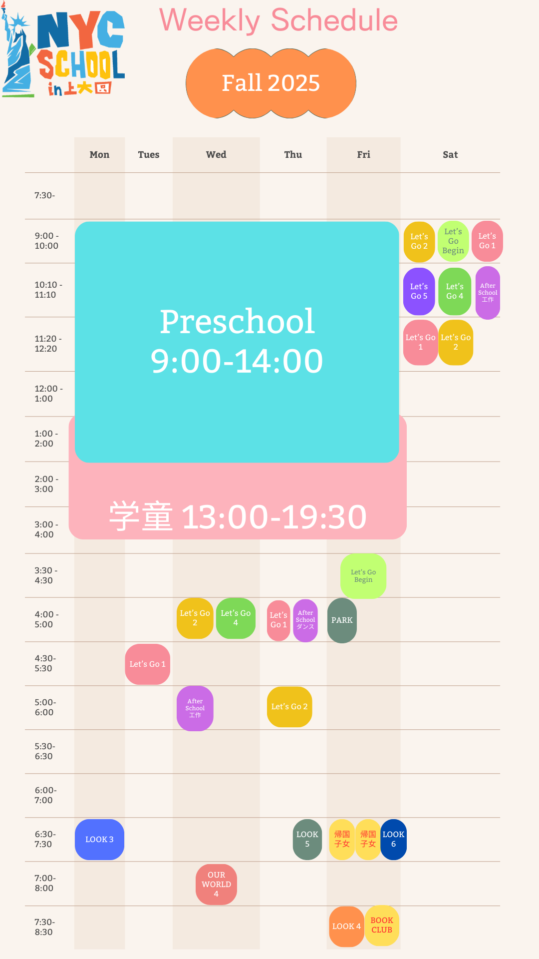 NYCでは30分ベビークラスから、60分グループレッスン、Book Club、大人の単発レッスン、フランス語単発レッスン、アフタースクール(英語で学童)、個人レッスン、平日は認可外保育施設(設置済み)など様々なコースを揃えて、お忙しい方も、じっくり英語を学びたい方も、生活やニーズに合わせてクラスをお選びいただけます。